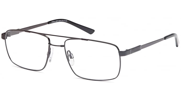 This is a full-rimmed, aviator frame made from flexible titanium and features soft, adjustable nose pads, flexible hinges and a single bar across the bridge.