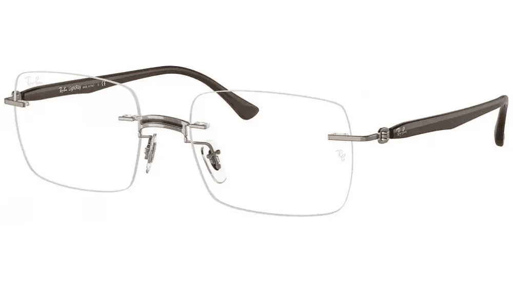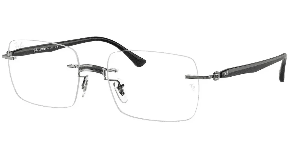 The RX8767 is a square rimless frame that’s made from high-quality, lightweight titanium and available in 2 different colour options. The unisex frame also provides a snug fit around the ears and nose for an adaptive fit and is finished with metal pin detailing and the Ray-Ban logo embossed on the temples.Â
